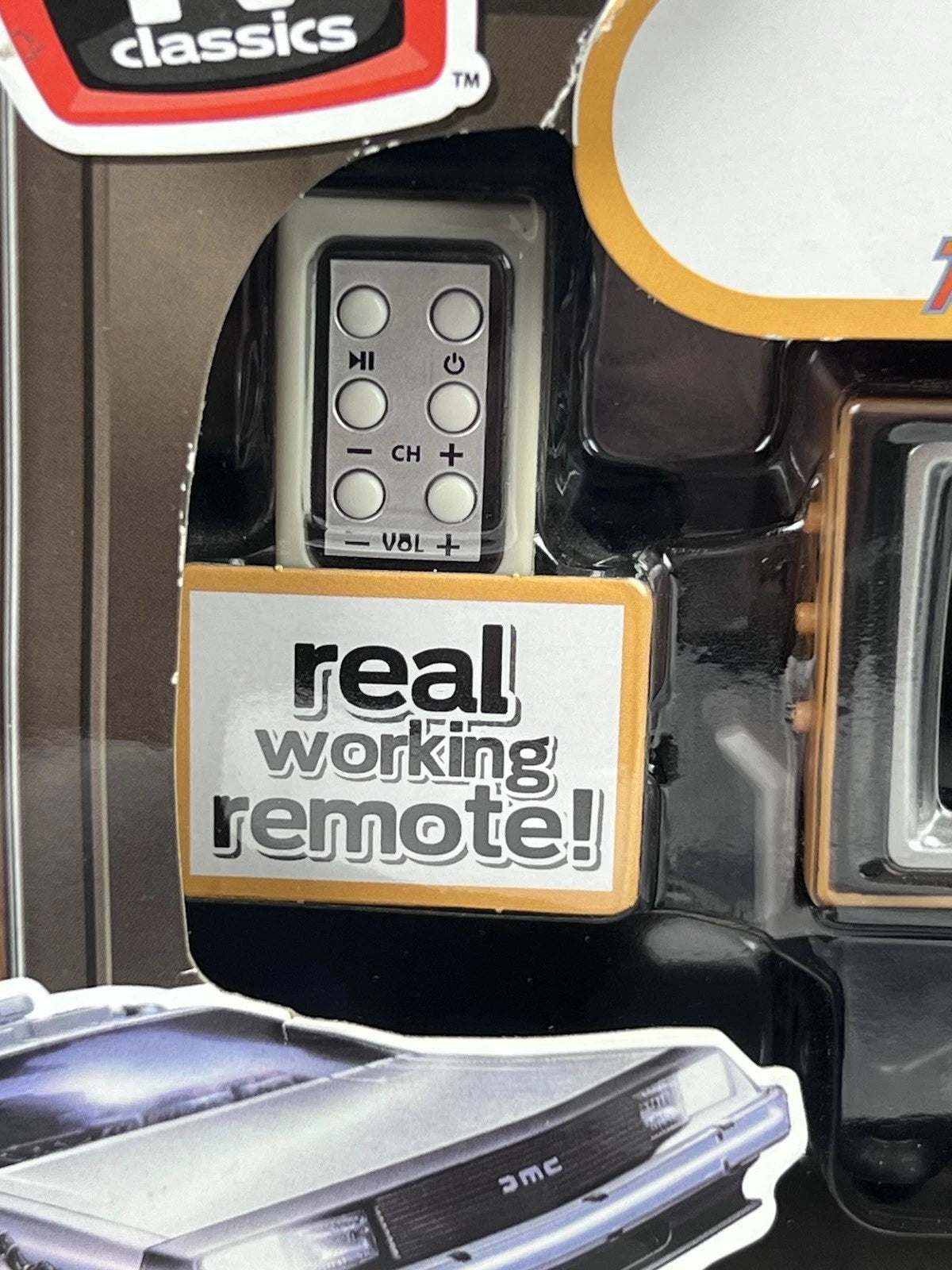 Back to the Future Tiny TV Classics – Mini Collectible TV w/Remote. The box has some minor damage to it with a couple small tears on the front but does not affect the functionality of product at all.